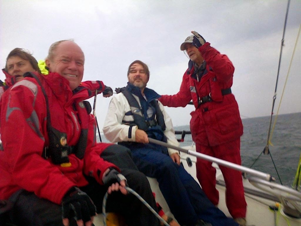 Around the windward mark, hoisting the chute went alright and we got moving over 9 knots downwind. We had to gybe to get to the finish. First time I had to gybe the chute on the boat. The end for end gybe went well except I reversed the new guy and we wouldn't bring the chute close to the pole because of the forces of the reversed guy on the jaw pin. It was only about 3ft out, so we left it and finished. the race. 4th over the line of 9 boats in our class.